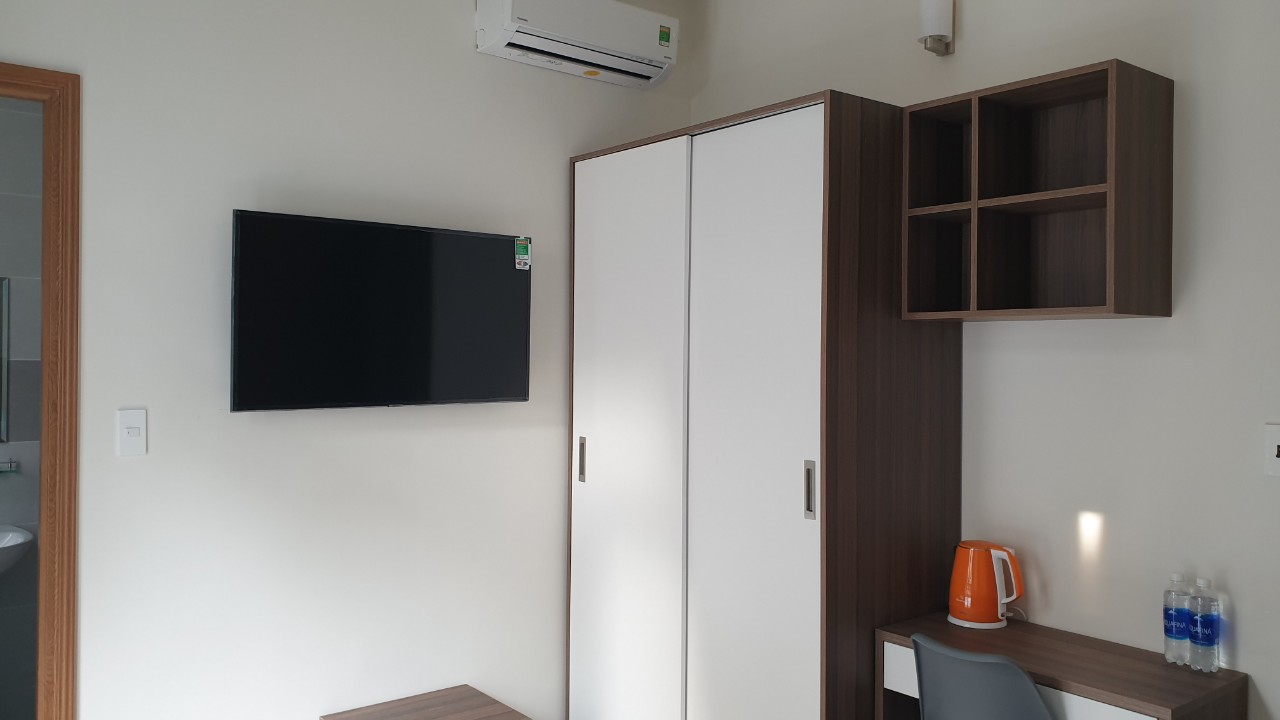 Trang bị: Máy lạnh Toshiba, đèn LED, kệ để giầy, WC riêng đầy đủ thiết bị nhà tắm, Giường, Tủ, Bàn, Ghế, Kệ sách, Ti vi, Tủ lạnh.